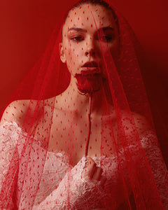 Touches of red bloom throughout the collection, like whispered vows of passion — rose petals scattered across veils, a crimson bolero draped over lace, a stage set in scarlet to let the white shine brighter.