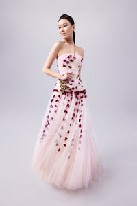 A Melange of Powder Pink and Cream Strapless Ankle-Length Tulle Dress Featuring Handcrafted Lily of the Valley Flowers Made from Bordeaux Chiffon, Cascading Beautifully from the Waist